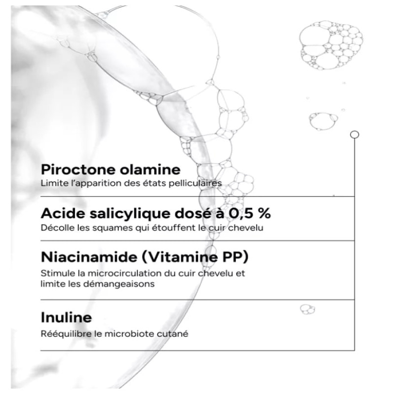 ماء، كبريتات لوريث الصوديوم، حمض الساليسيليك، ثنائي بروبيلين جليكول، أكريلات/بوليمر متقاطع أكريلات ألكيل C10-30، كوكو بيتاين، بيروكتون أولامين، لاكتات الصوديوم، إينولين، جليسيريل أونديسيلينات، زيت خشب العرعر أوكسيسيدروس، نياسيناميد، بانثينول، ديسيل جلوكوزيد، حمض الجلسرهيتينيك، جليسيريل أوليات PCA، سوربيتان كابريلات، ليفولينات الصوديوم، هيدروكسيد الصوديوم، بنزوات الصوديوم، حمض الستريك